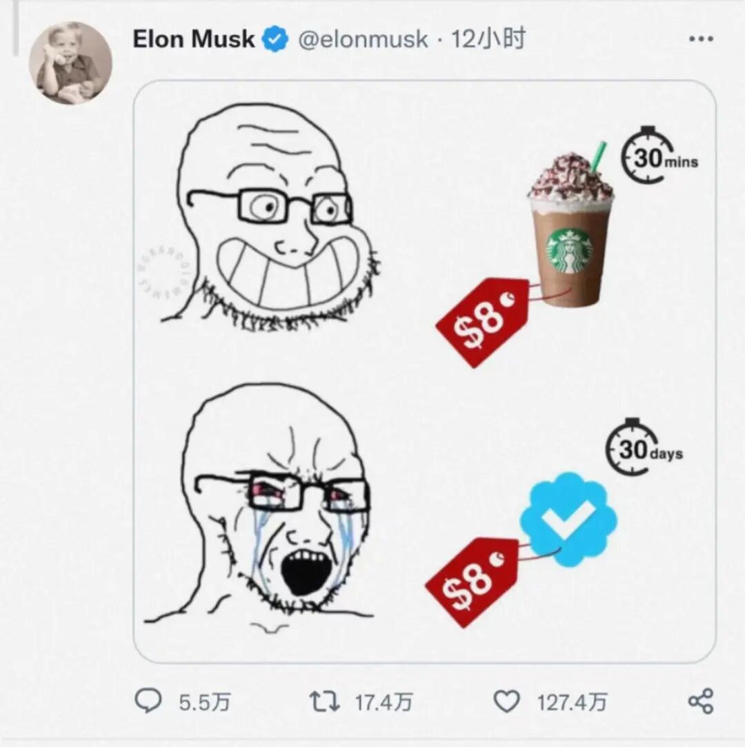 深受质疑之后,马斯克发布内涵图借星巴克之手证明8美元认证的划算之处。在图中一男子望着8美元的饮品开心的表示:能喝30分钟;而哭泣的面对8美元的“蓝V认证”表示:能用30天。