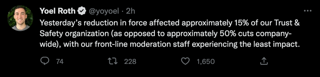 昨天开始,推特遍迎来第一波裁员,推特安全与诚信主管Yoel Roth透露,裁员导致了大约50%的员工失业。