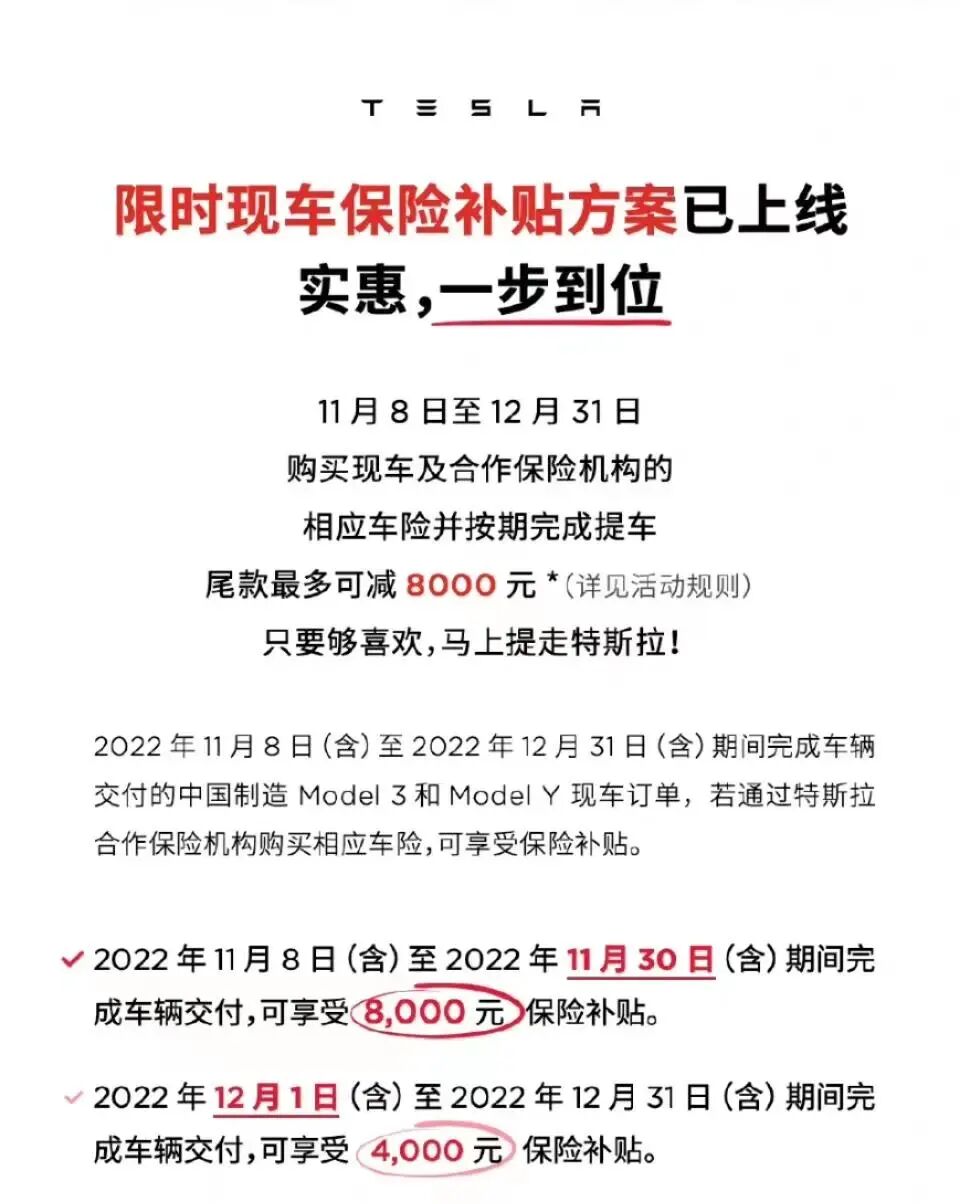 翻译过来就是,在这期间,购买中国制造的Model 3或Model Y,如果通过特斯拉合作的保险机构买车险,就能享受保险补贴,最高减8000元。
