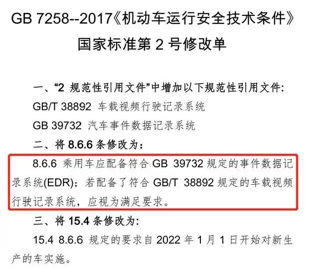 其实,根据去年公安部发布的《机动车运行安全技术条件》国家标准第2号修改单,从2021年1月1日起,我国新生产的车辆就应全部安装事件数据记录系统(EDR)。