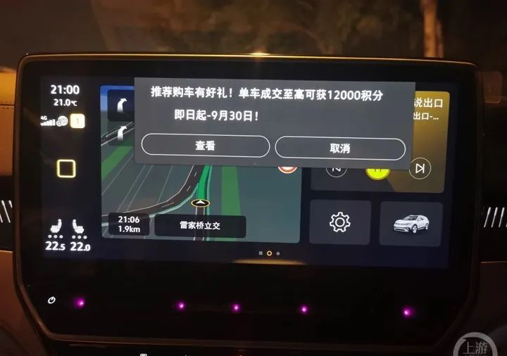 今年9月,一位一汽大众ID.6CROZZ 的车主表示,自己在驾驶新买的车辆正常行驶,使用车载导航的时候,中控大屏上突然弹出了购车优惠的广告。