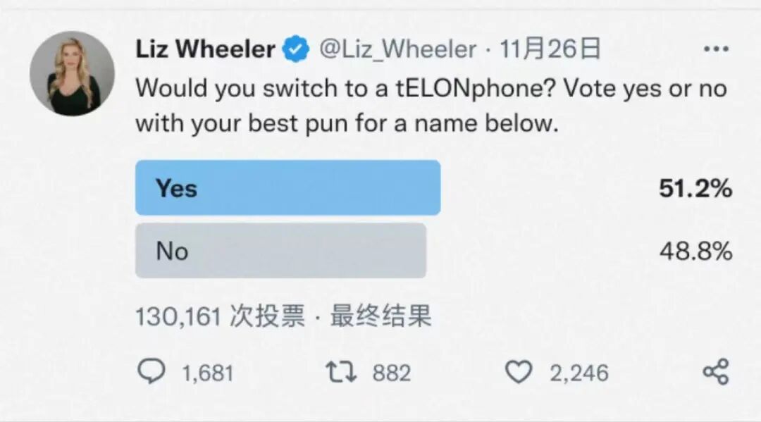 利兹·惠勒在网上发起了一个投票,问网友是否会支持马斯克手机,目前为止超过13万人投票,有51.2%的网友表示同意。
