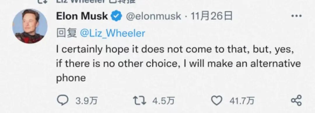 利兹的吐槽很快引来本尊的回应,马斯克回复称,如果推特真的从苹果谷歌下架,在没有其他选择的时候,“我会生产一款自己的智能手机作为替代品”。