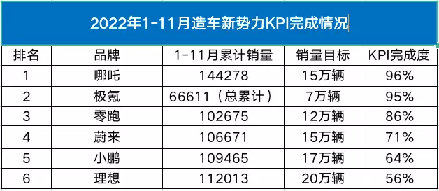 蔚来、理想和小鹏今年的销量目标分别是15万辆,20万辆和17万辆。但截至11月,三者累计销量分别为106671辆、112013辆、109465辆,完成度仅五六成。