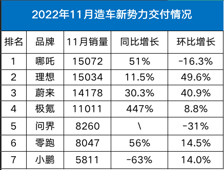 这也让车企的比拼显得异常激烈。12月1日,新造车们陆续公布11月成绩单,不少品牌的销量都突破万辆,其中哪吒汽车15072辆,理想汽车为15034辆,两者仅相差38辆。