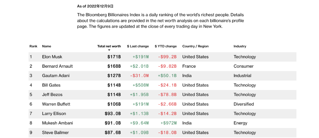 虽然福布斯排行上马斯克不是世界首富了,但在彭博亿万富翁排行榜上,马斯克仍然以1710亿美金的净资产排在榜首,阿诺特以1680亿美元盘踞第二。