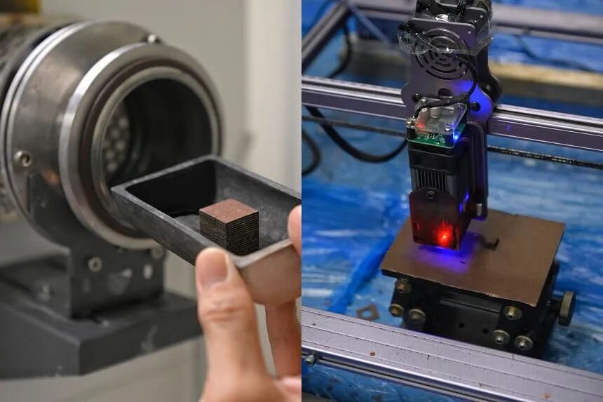 ),把几张牛皮纸暴露在高温下,并用激光切割,使其形成不同的几何形状。来源:NTU