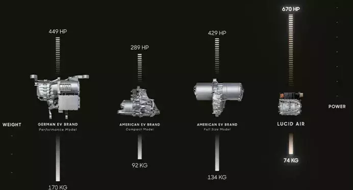 Lucid Air中的紧凑型电机是目前最轻、最强大的电机之一,这个电机的额定功率为670马力,但重量只有67磅。