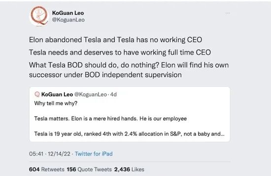 特斯拉的第三大个人股东、华裔企业家廖凯原(koguan leo)上周四连发数条推文,公开喊出了让马斯克“下课”。