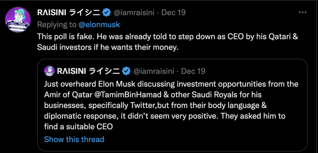 有人认为,这个投票是假的,因为马斯克也在为推特寻找投资者,而卡塔尔和沙特的投资者已经告诉他,如果马斯克想要他们的钱,就得辞去CEO一职。