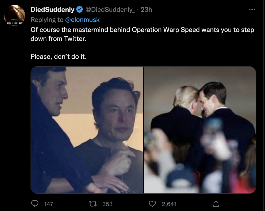 还有一些推特用户的猜测,根据马斯克最近的个人社交情况,比如周末一起看世界杯的特朗普女婿贾里德库什纳,这又牵扯到了推特最大的投资者沙特王室,也就是库什纳的前东家,不免令人怀疑,马斯克和库什纳为何关系如此密切。
