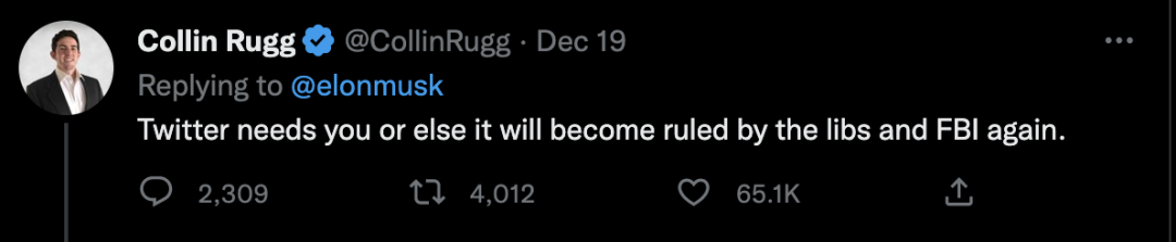 推特需要你,否则它将再次被自由党和联邦调查局统治。在不到两个月的时间里,你已经让Twitter变得好一百倍,现在请不要停下来。