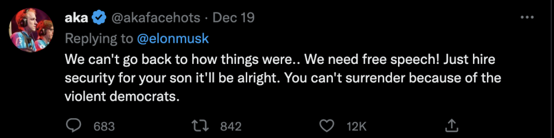 有人为了让马斯克继续担任推特CEO,甚至建议让马斯克给他儿子配个保安...“不能向暴力的民主投降。”