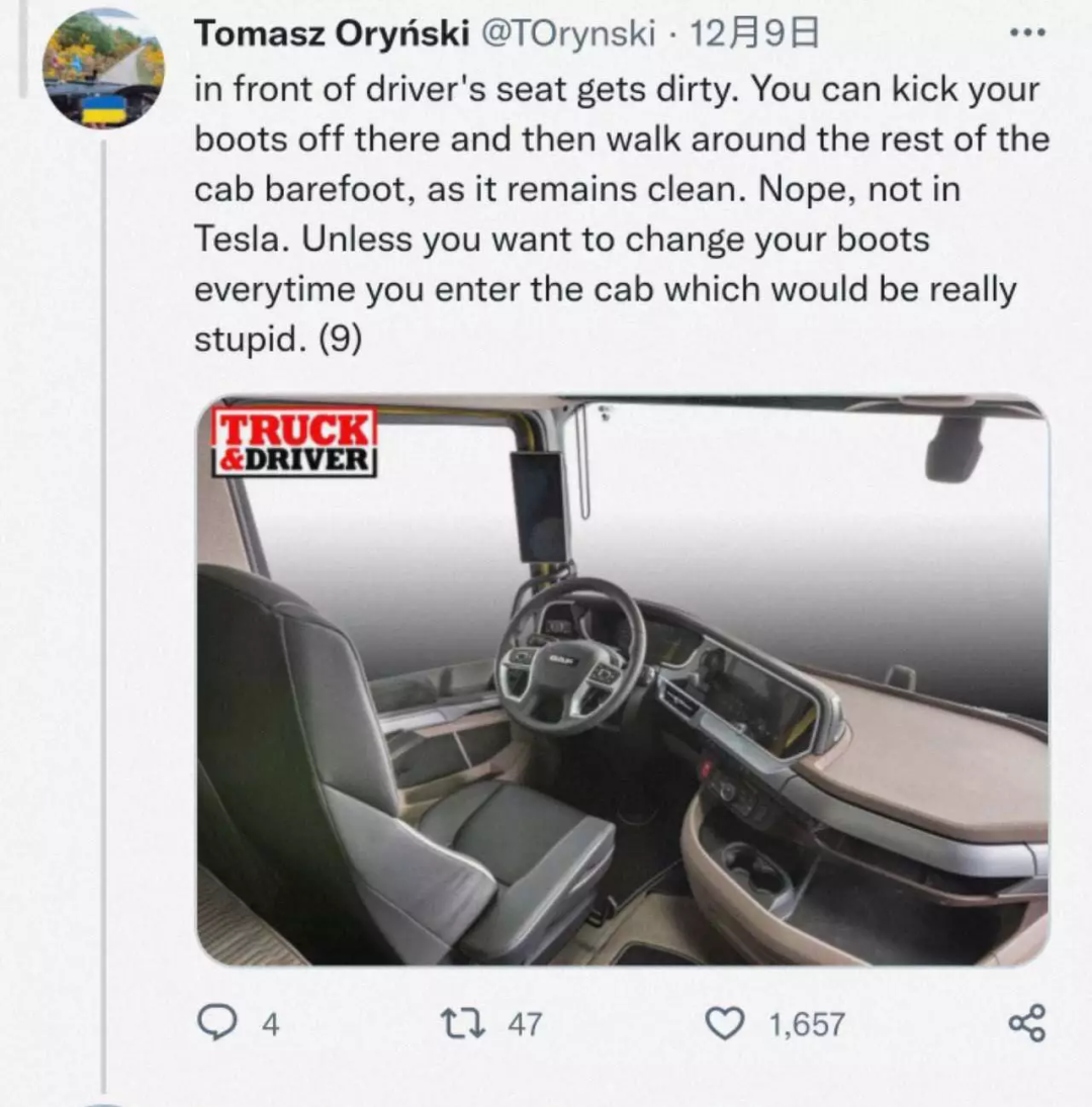 “特斯拉设计这款车时,肯定没有让大部分时间在卡车驾驶室中的工人参与进来。”