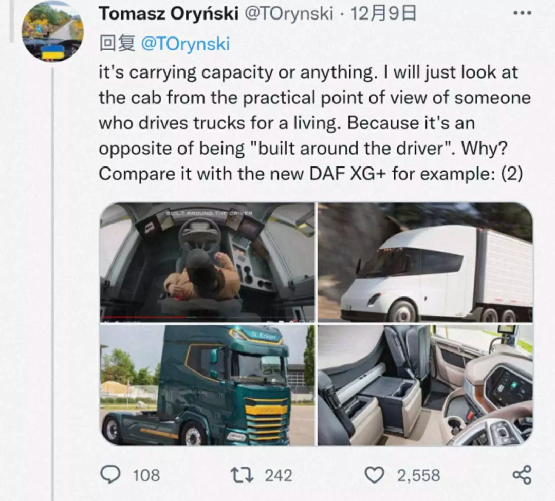 他并没有说Semi的承载能力或者其他问题,而是单纯的从驾驶座舱的角度分析了实用性。最终他得出结论,这是一个非常失败的产品。