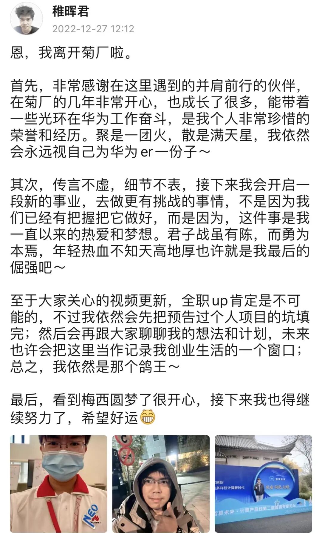 刚刚,稚晖君在B站更新了动态,官宣离开华为。