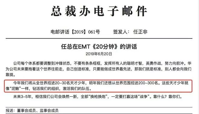 任正非表示,这些天才少年就像泥鳅一样,钻活我们的组织,激活我们的队伍。