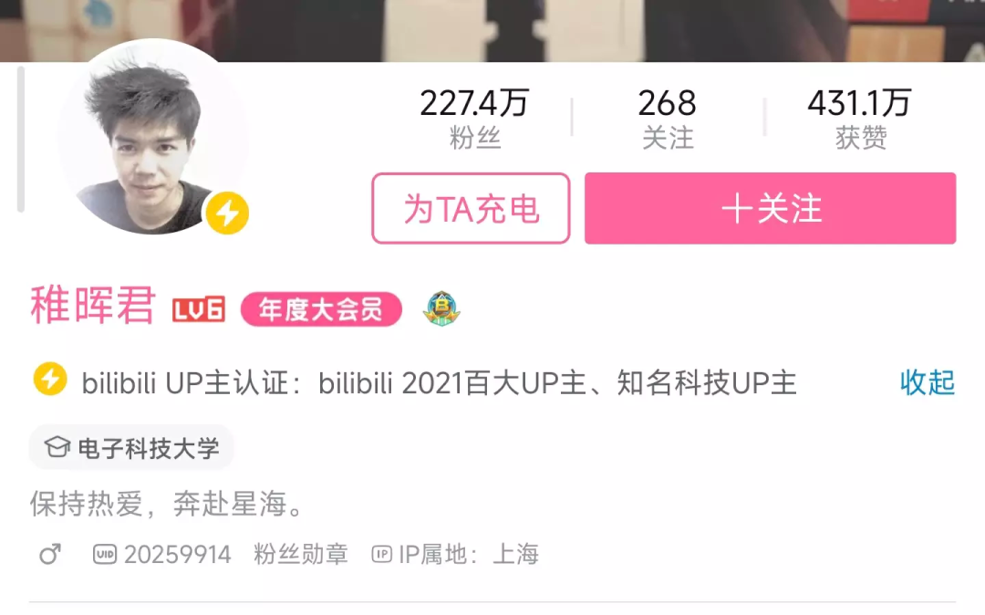 就像他在B站自我介绍里说的那样:保持热爱,奔赴星海。