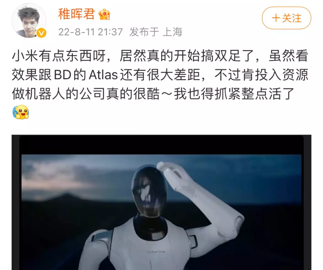 值得一提的是,今年8月份,稚晖君就点赞了小米研发出的机器人,直言自己需要抓紧整活。