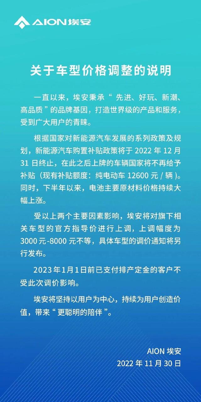 紧接着,广汽埃安也发布了有关车型价格调整的说明,其中明确表示将对旗下相关车型的售价上调3000元至8000元不等。