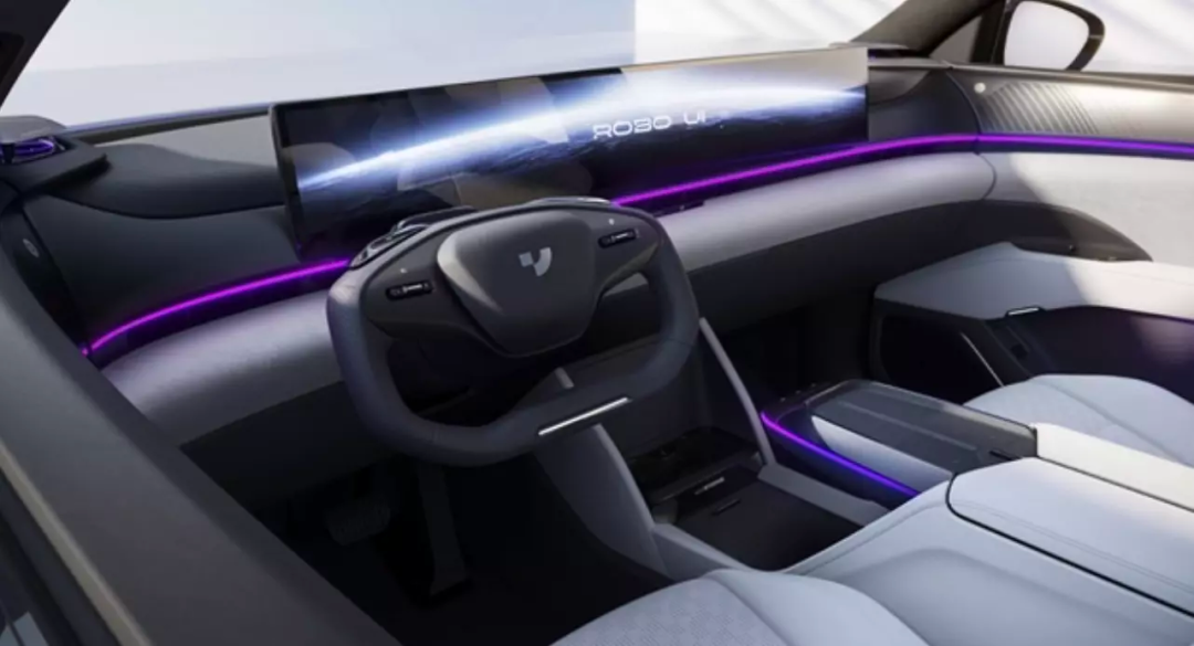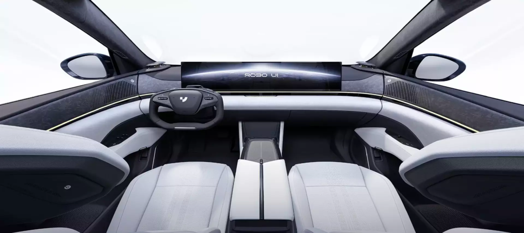 ROBO-01取消了车外门把手、换挡杆、中控按键等大部分物理操控,并保留了U型方向盘、一体化超清大屏、共情交互大灯等极具未来感的设计。