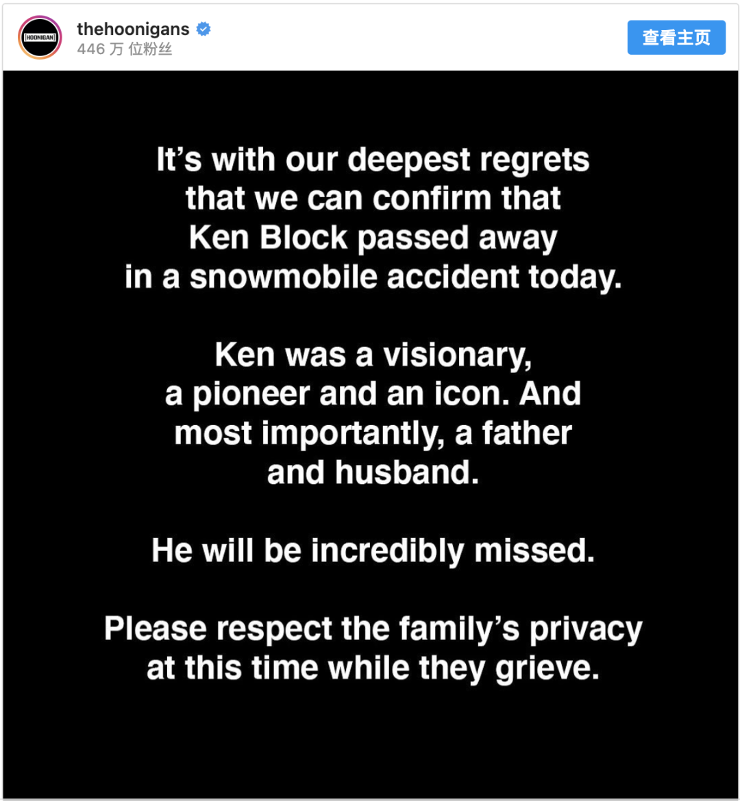 美国拉力赛事协会在官方社交平台上表示哀悼,同时Ken Block的43岁的妻子Lucy,也在自己的社交平台上发布了一张Ken Block著名的43号。