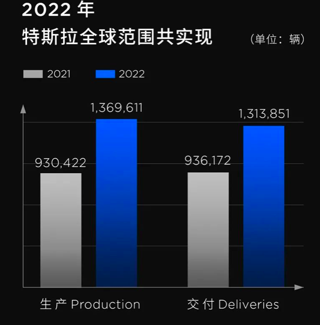 元旦过后,特斯拉发布了2022年全球生产与交付数据,共计生产136,9611辆新车,全年累计交付131,3851辆,仅次于比亚迪的186万辆。