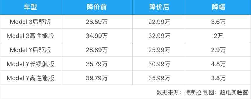 当时在售的Model 3/Y车型均下调了售价,其中Model 3后驱降价1.4万,高性能版降价1.8万,Y车型降价更狠,后驱版降价2.8万,四驱版降价3.7万。