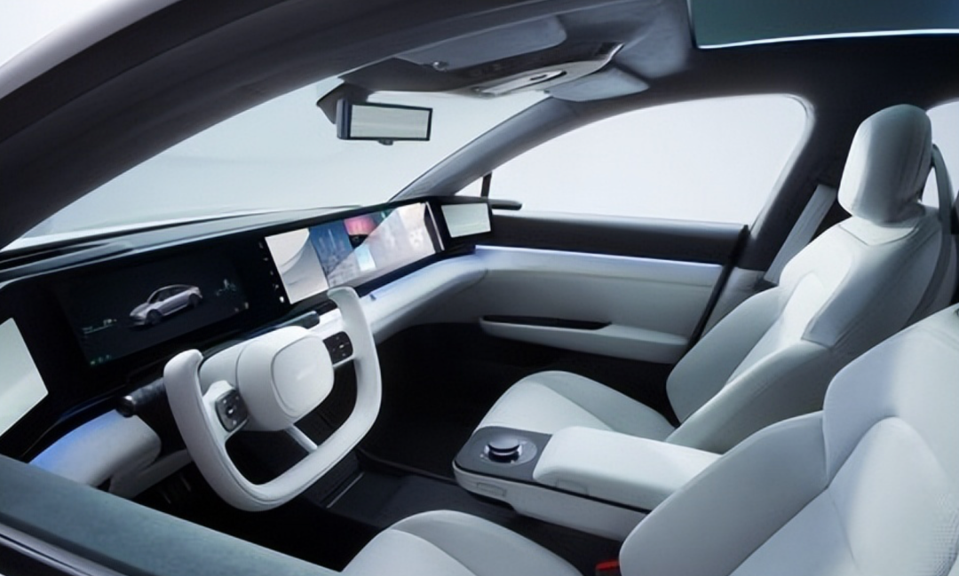 外观来看,与索尼在去年CES上亮相的概念车 Vision-S 02 有几分相似,只是没有惊艳的感觉,采用了大尺寸的贯穿式双屏,加左右两侧虚拟后视镜,弯折屏幕组成的联动系统,上方还有着独立的HUD抬头显示。