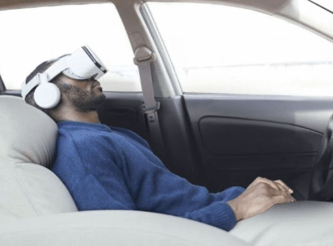 后排的乘客还可以佩戴相应的VR设备,在游戏界面与车辆保持同步,通过转移注意力的方式,来解决乘客晕车的问题。