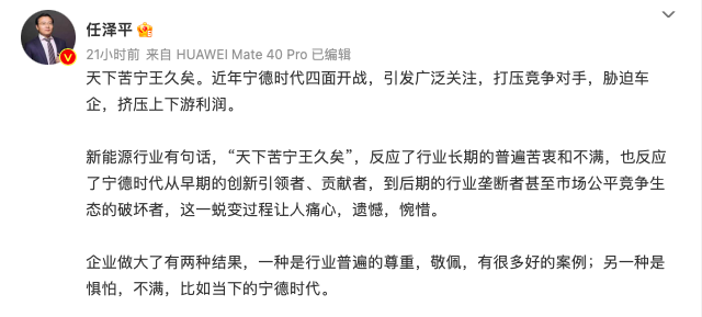 这篇千余字的小作文,句句诛心。任泽平也没有给宁德时代留情面,炮轰宁德时代丝毫没有“做老大”的样子,还打压竞争对手,胁迫车企,挤压上下游利润。
