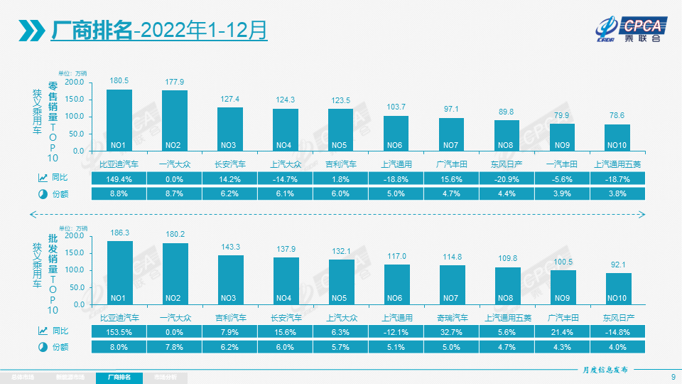 而整个乘用车市场也全靠新能源车带动增长,2022年乘用车零售2054.3万辆,同比增长1.9%,零售同比净增38.6万辆。显然,如果没有新能源车,2022年乘用车市场又将会是负增长。