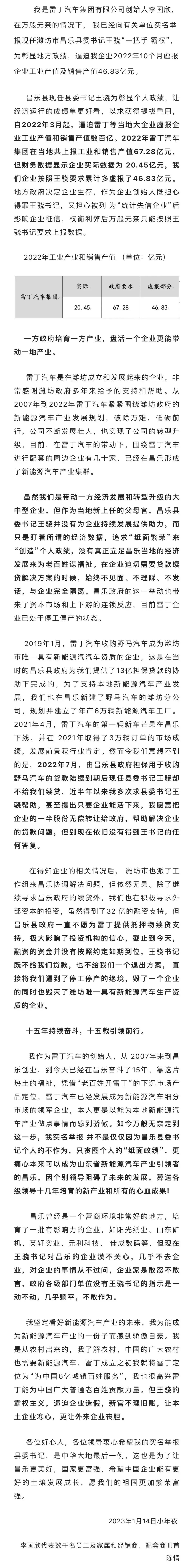 在这封公开的举报推文中,李国欣表示,在万般无奈的情况下,向有关单位实名举报,称被举报人为了彰显政绩,逼迫雷丁汽车虚报产值。