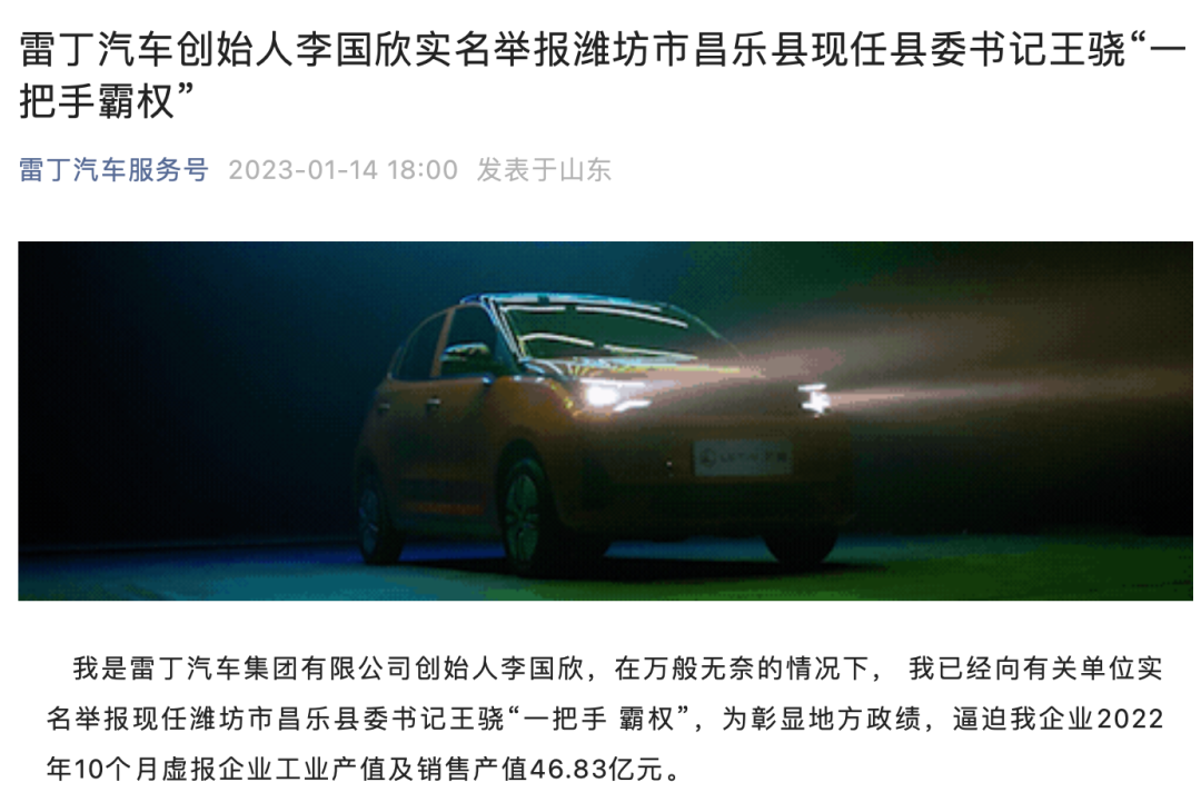 雷丁汽车创始人李国欣,实名举报当地政府有“一把手霸权现象”。