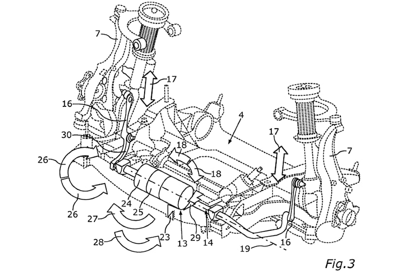 宝马的这套专利设计,巧妙地将一个发电机组和底盘结合起来,这台小的发电机有一个小飞轮和一个单向离合器,并由一个驱动盘(actuating disc)去执行,然后通过一个类似于防倾杆设计的稳定杆和悬挂控制臂连接。