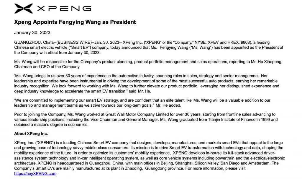 2023年1月12日,有消息传出王凤英要加入小鹏,还将接替何小鹏CEO的位置,不过当时的小鹏并没有回应这一消息,只是表示公司自2022年下半年开始就在进行组织架构的调整,在新的一年也将会不断的进行组织变革,如果有新的消息会及时公布。