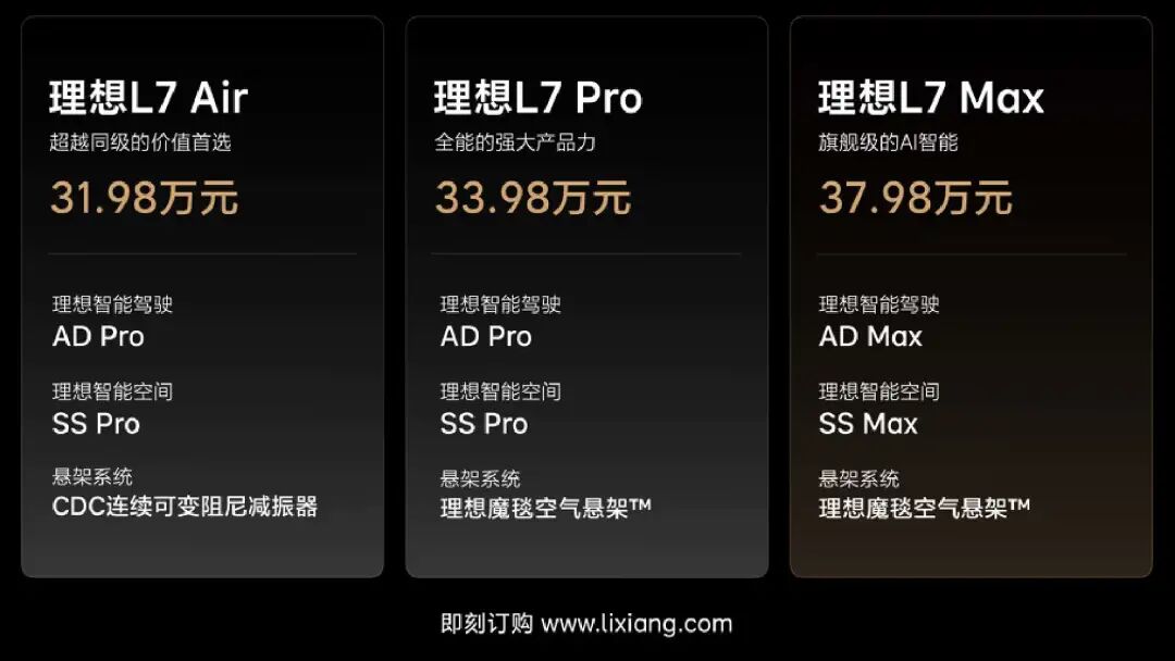 理想L7,套娃系列第三款车,也是理想首款5座SUV。除了先前公布的售价为33.98万的 Pro和37.98万元的Max两款车型外,还新增入门款车型理想L7 Air,售价为31.98万元。