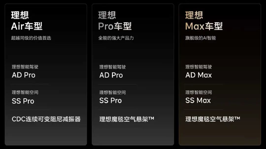 相比Pro和Max车型,Air版本取消了空气悬挂等配置,但也配备有理想智能驾驶辅助系统以及理想智能空间。