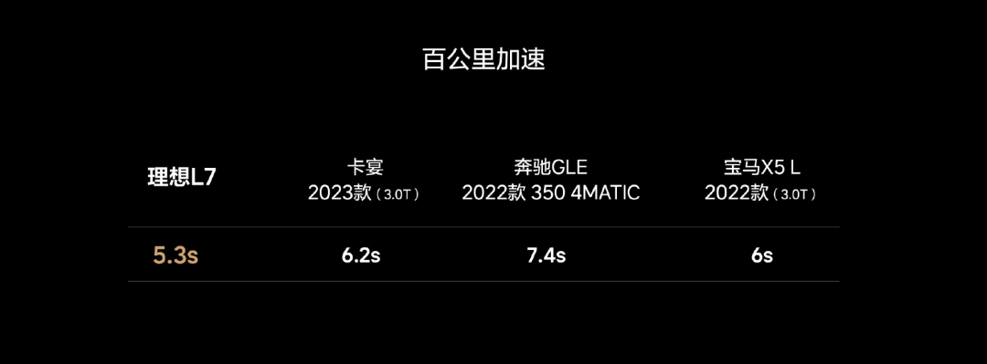 谈及性能,理想也按照惯例,没把豪华品牌选手放在眼里,比卡宴、奔驰GLE和宝马X5L都要快。