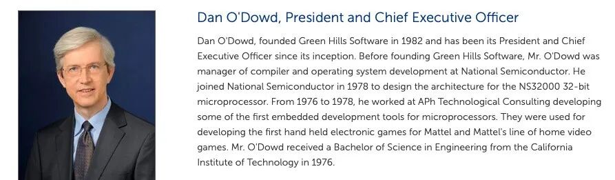上世纪80年代,丹·奥多德创立了软件公司Green Hills,平均每年收入增长近30%,现在已经是世界上最大的独立RTOS公司。所以,丹·奥多德早已经实现了财富自由,是位亿万富翁。