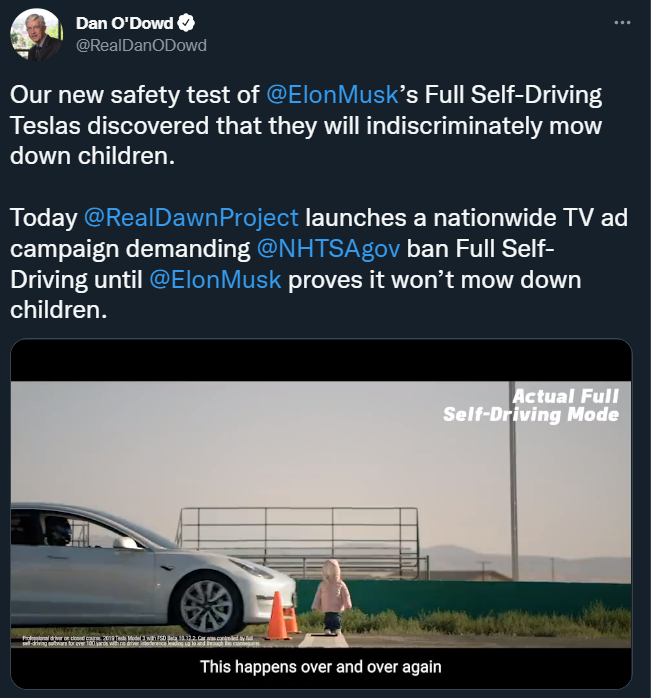 奥多德在一份声明中表示,特斯拉在公共道路上鲁莽部署全自动驾驶软件是对公共安全的重大威胁。