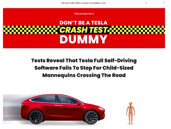 在超级碗广告投放之前,丹·奥多德去年还在《纽约时报》上刊登了整版广告,称特斯拉的全自动驾驶导致“每八分钟就会发生一次严重故障”,认为特斯拉的“全自动驾驶”是最糟糕的软件。