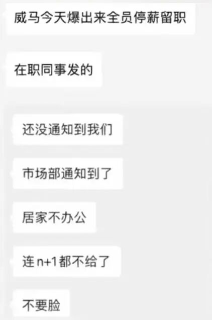 最近又有接近威马人士爆料,公司开始全员停薪留职,或“将所有部门预算缩减25%”。网传聊天截图显示,威马市场部被通知居家不办公,也不给N+1。