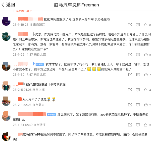 1月19日,威马汽车CEO沈晖的微博,自动推送了生日动态。现如今这条动态下的评论已经被车主和员工的声讨所覆盖。