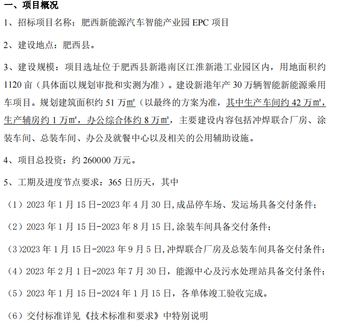 值得一提的是,在中建集团发布中标文件的前一天,江淮汽车还发布了“对江淮新港年产30万中高端智能新能源乘用车建设项目涂装工艺设备的设计、制造、安装、调试、培训及售后服务等”的招标公告。