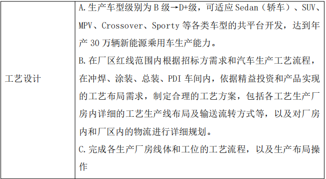 在招标文件的工艺设计要求里提到,工厂建成后生产车型级别从B级覆盖到D+级,需要适应Sedan(轿车),SUV,MPV,Crossover,Sporty 等各类车型的共平台开发,达到年产 30 万辆新能源乘用车生产能力。