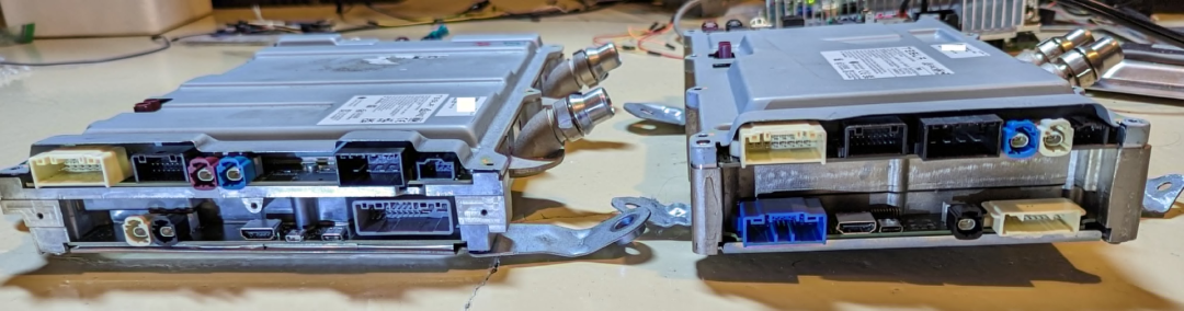 两代的硬件接口也有很大的变化,HW3.0的原本有9个摄像头借接口,HW4.0增加到了12个,每个插口上都标记了摄像头的连接位置,比如F-SVC,L-SVC,R-FF-Rear 等,其中一个标注为备用。
