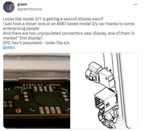 这是因为其发现了在即将改款特斯拉 Model 3 和 Model Y 搭载的 AMD Ryzen 处理器电路板上,具备一个类似“第二显示屏”的接口设计。