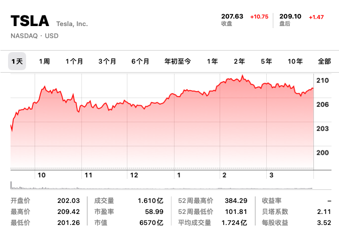 昨天,特斯拉以每股207.63美元的高价收盘,市值达6570亿美元,马斯克的身价也达到了1870亿美元。
