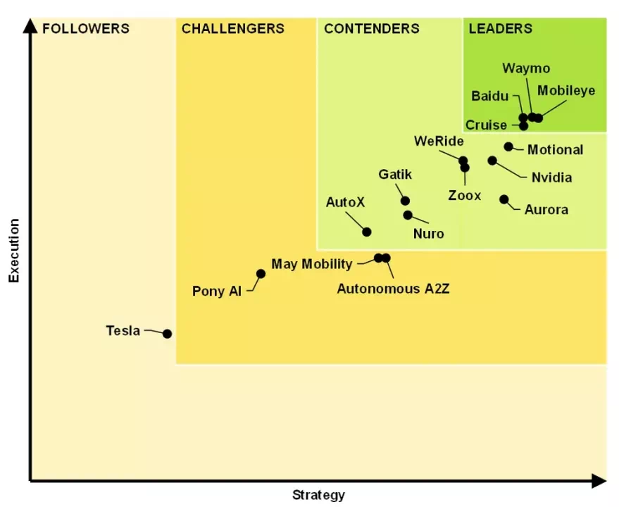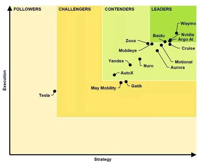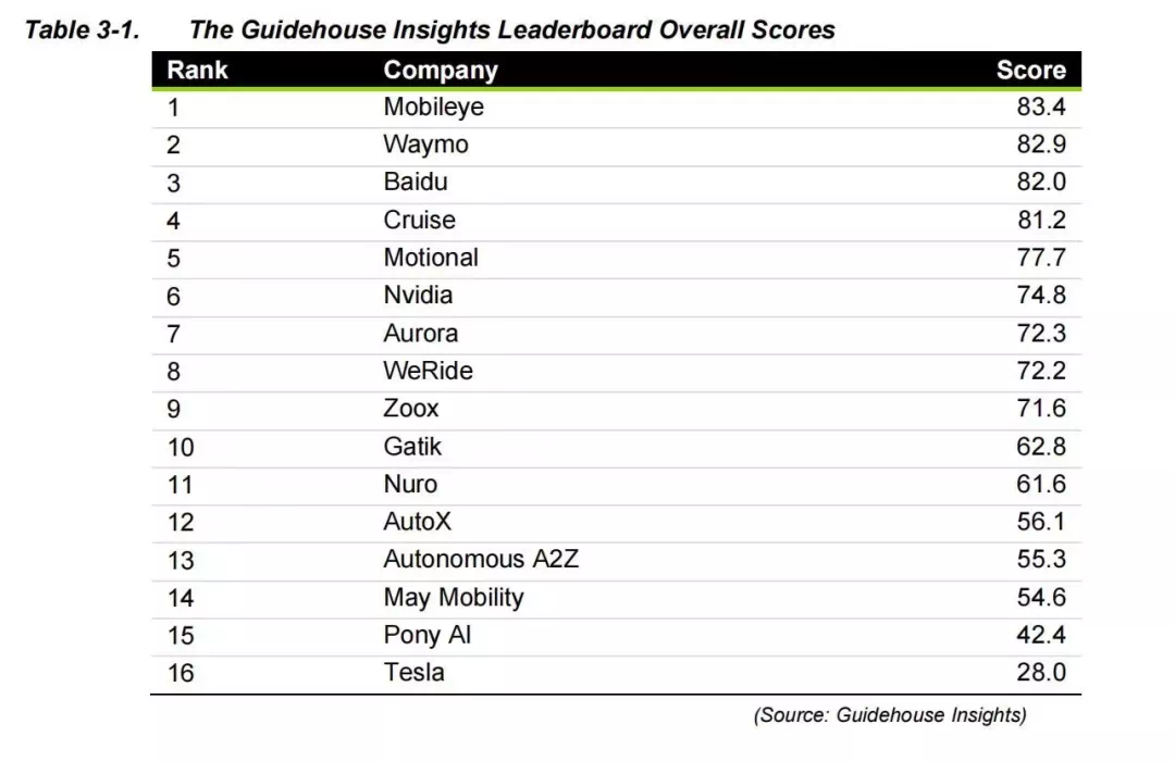 来自Guidehouse的全球自动驾驶公司最新榜单出炉了,在16家自动驾驶公司榜单中,特斯拉排名第16,也就是倒数第一。